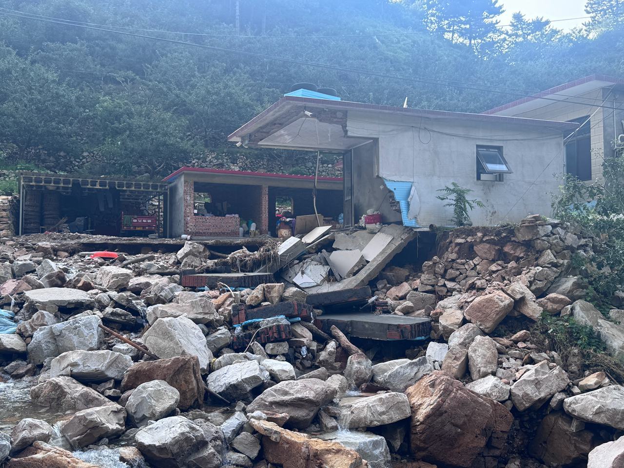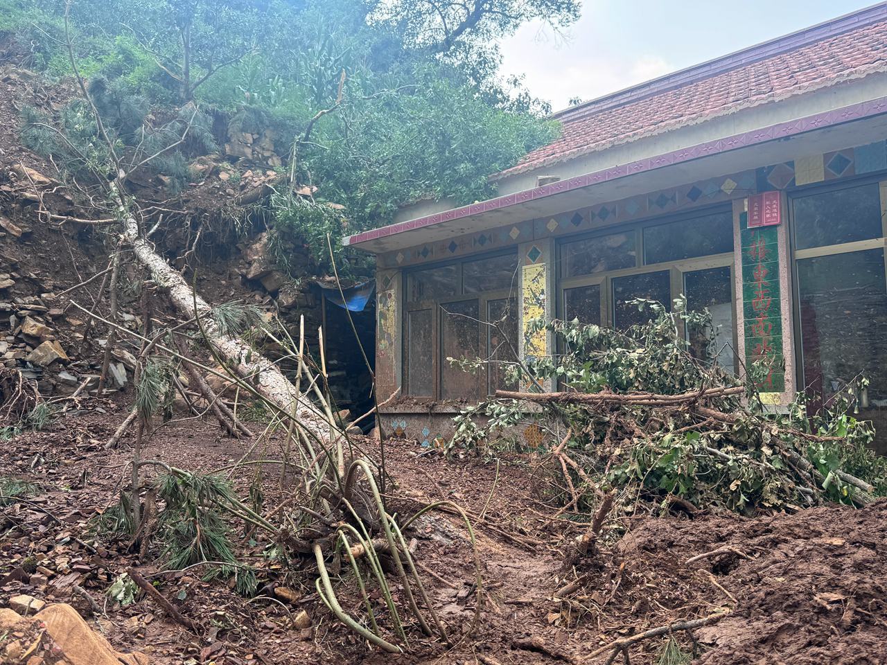 响水湖村的多处道路被严重损毁,大部分村民的房屋未受到较大影响,但也有几户人家受灾严重。记者在村民孔凡友的家里看到,山上的碎石和泥石流掩埋了家中的仓库和水窖,家门口全是淤泥。孔凡友说,他家储存的粮食和部分物品全部被淹。